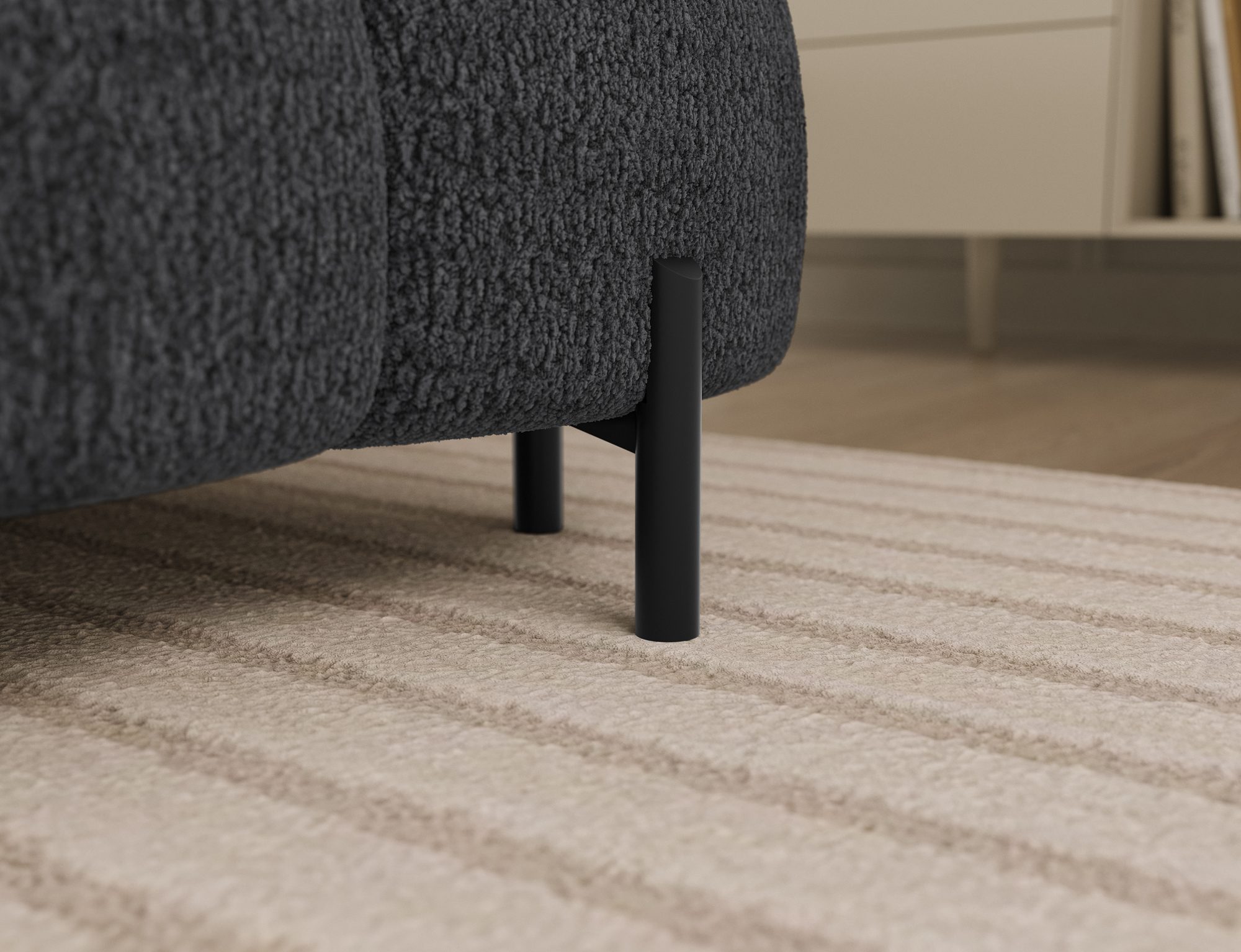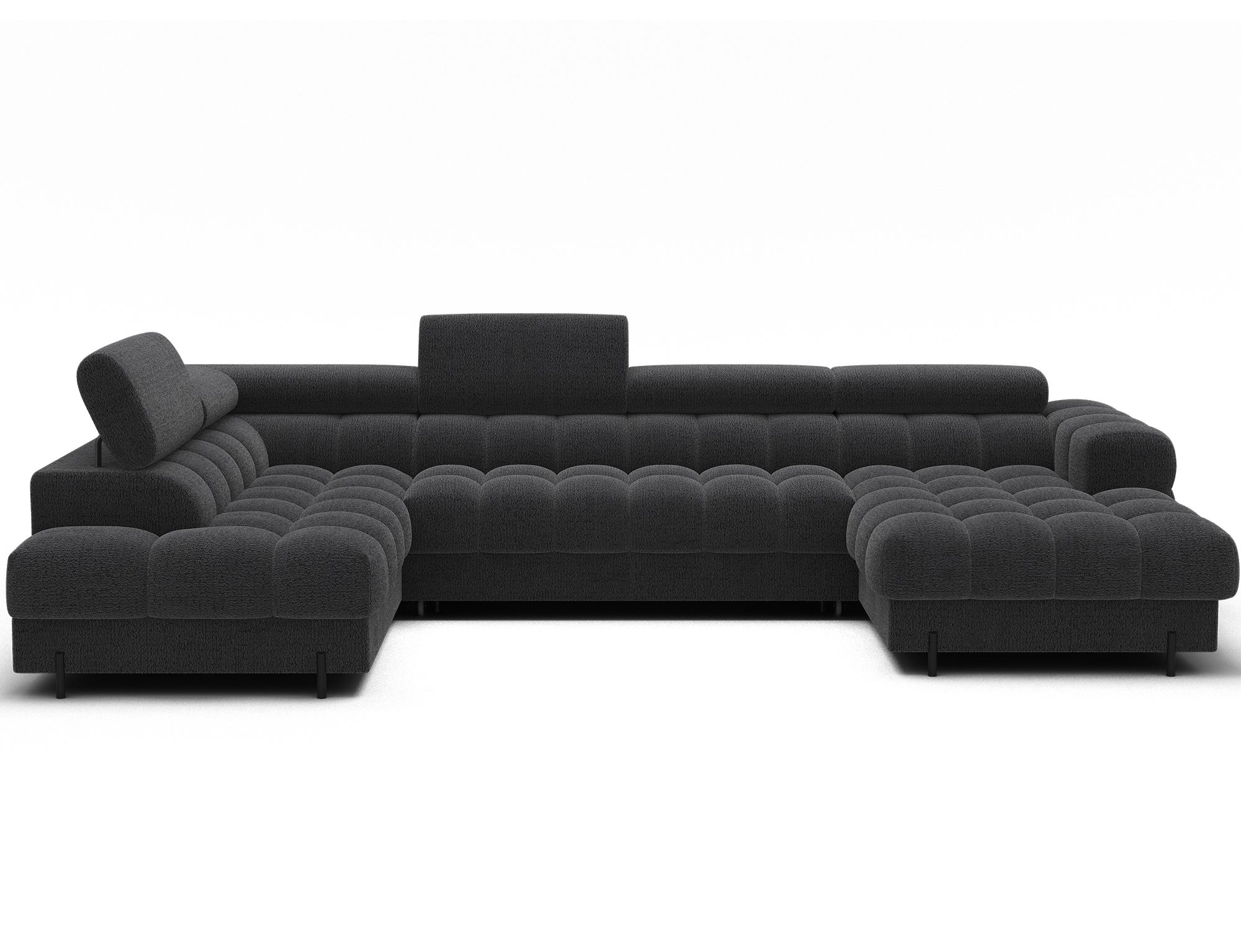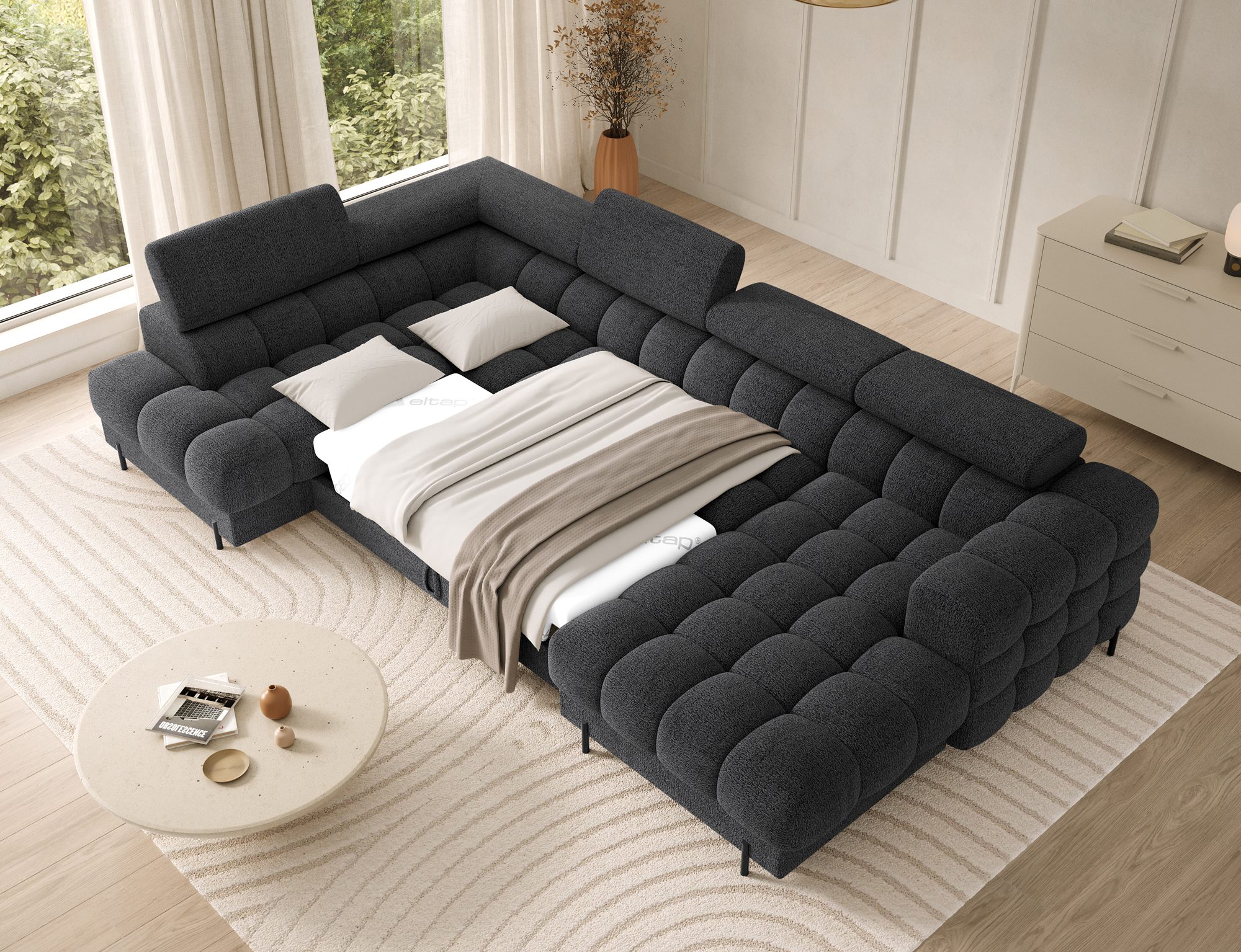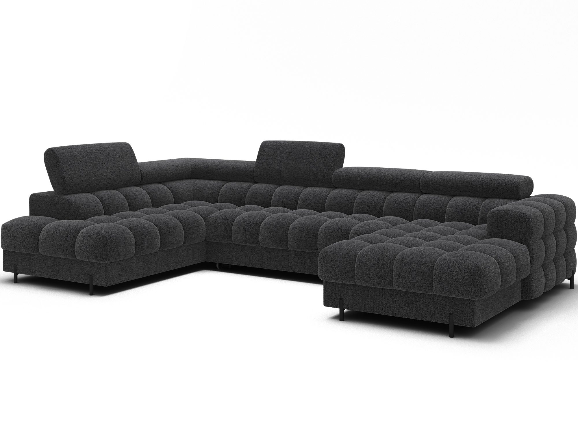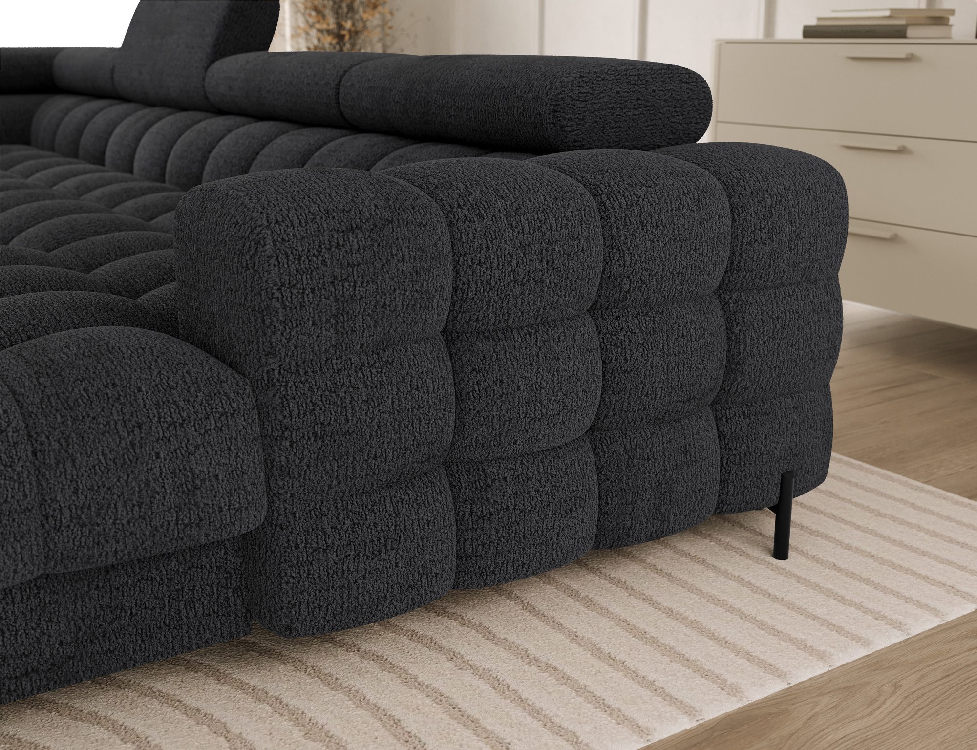 The Feraria corner sofa, with impressive dimensions of 358x202x93 cm, is a modern and functional piece of lounge furniture designed for spacious, stylish living rooms, featuring a type B wave spring system and two types of foam – T3030 and profiled HR3030 – it offers excellent comfort both for sitting and daily sleeping, the practical sleeping function allows for quick conversion into a comfortable bed, while the spacious bedding container provides extra storage space, the fully upholstered backrest enables free placement anywhere in the room without the need to push it against a wall, offering great flexibility in interior arrangement, the entire structure is supported by sturdy black metal legs with a powder-coated finish, emphasizing the modern character of the sofa and adding visual lightness, Feraria is the perfect combination of style, comfort and functionality for those who value quality, design and everyday practicality in one piece of furniture.
